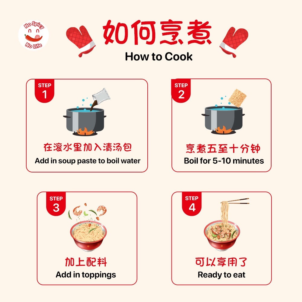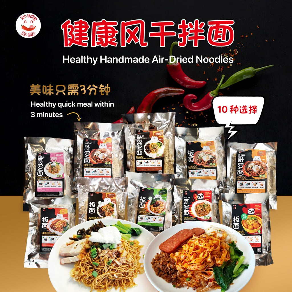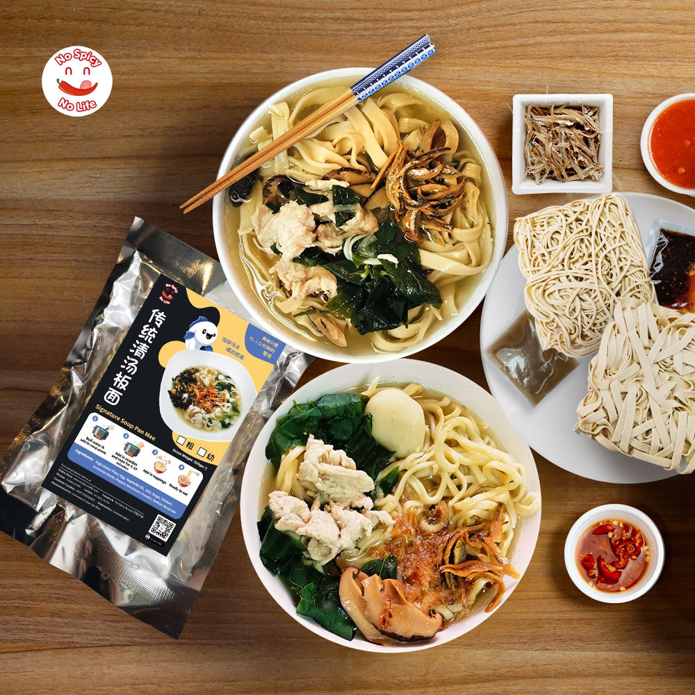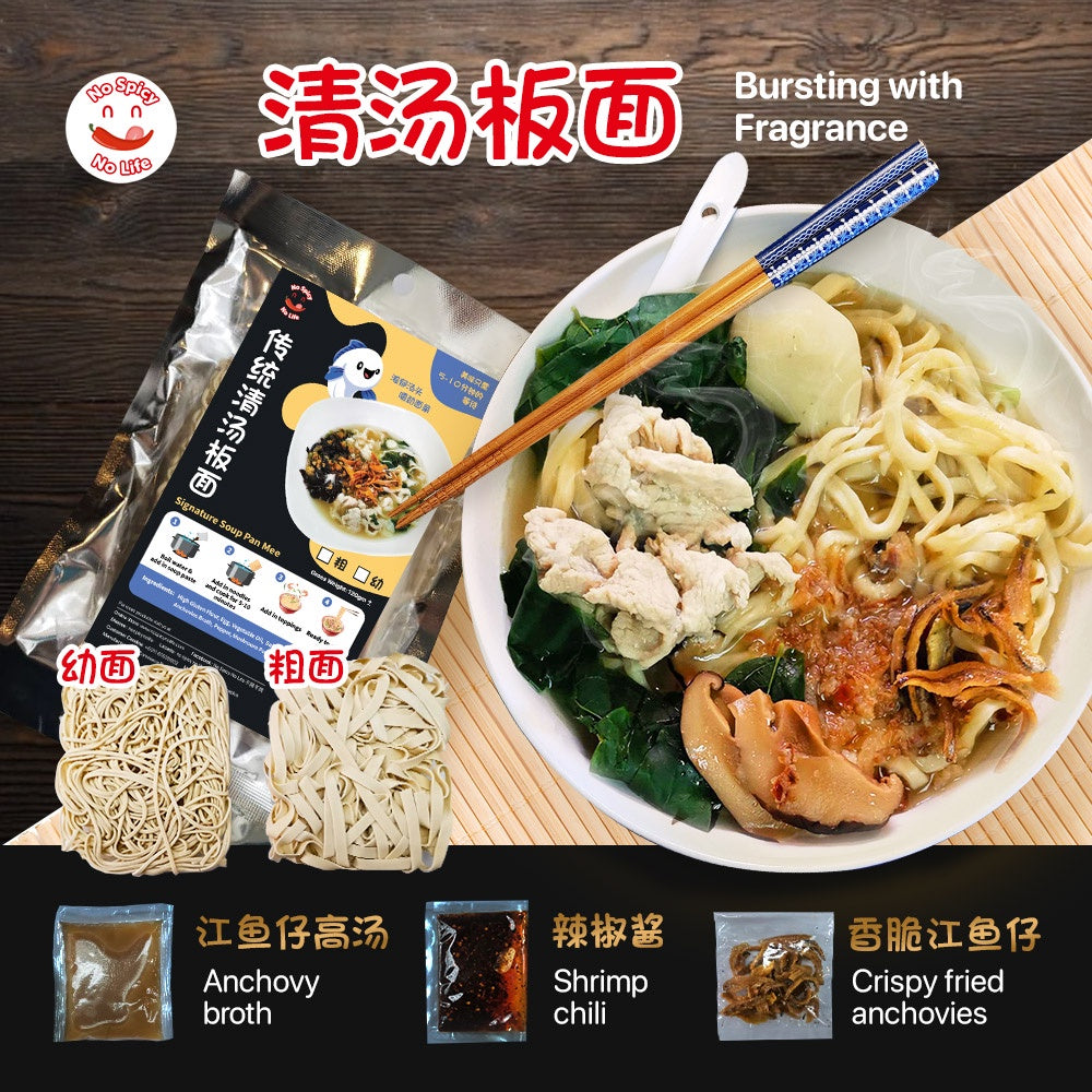 Pan Mee is one of the traditional Hakka noodles. In the early days, it was called "Dao Ma Qie". In Hakka dialect, "Dao Ma" means big knife. Since the noodle making machine has not been widely used, the chefs all use glass empty bottles to make the noodles. The dough is rolled flat and then cut into strips with a knife, hence the name Soup Pan Mee. Soup pan mee is generally found in restaurants, food centres, markets, coffee shops or roadside stalls in Malaysia. But to prepare a bowl of full-flavored soup pan mee, you need to boil the soup, knead the dough, and fry the ikan bilis, which is a lot of work and trouble. So No Spicy No Life has launched one of the soup noodle series - Soup Pan Mee with 2 options of noodles which is thick and thin. A unique soup, crispy ikan bilis and firm noodles, just follow the cooking instructions and add the ingredients you want, the Soup Pan Mee is easy to complete!